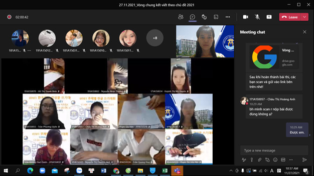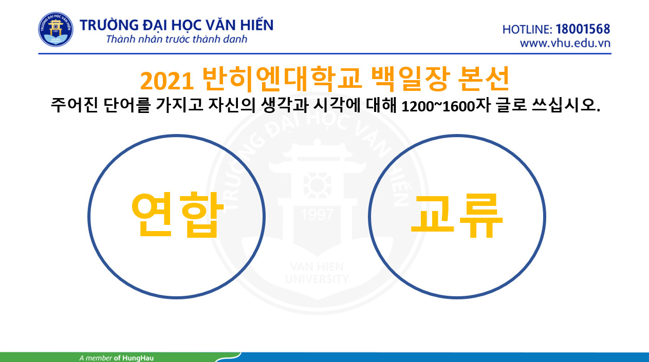 Ngày 28/11/2021 vừa qua cuộc thi "Viết Tiếng Hàn Theo Chủ Đề" vòng chung kết đã diễn ra trên kênh online google meet với sự tham gia của 12 thí sinh. Chủ đề cuộc thi là "연합" thí sinh được lựa chọn và trình bày ý kiến của mình.