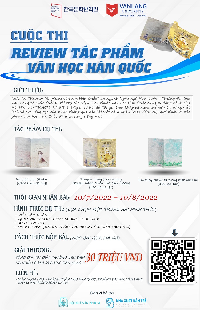 Cuộc thi “Review tác phẩm văn học Hàn Quốc” do Ngành Ngôn ngữ Hàn Quốc - Trường Đại học Văn Lang tổ chức dưới sự tài trợ của Viện Dịch thuật Văn học Hàn Quốc cùng sự đồng hành của Hội Nhà văn TP.HCM, NXB Trẻ. Đây là cơ hội để độc giả trên khắp cả nước thể hiện tài năng viết lách và sức sáng tạo của mình thông qua các bài viết cảm nhận hoặc video clip giới thiệu sách về tác phẩm văn học Hàn Quốc đã dịch sang tiếng Việt.