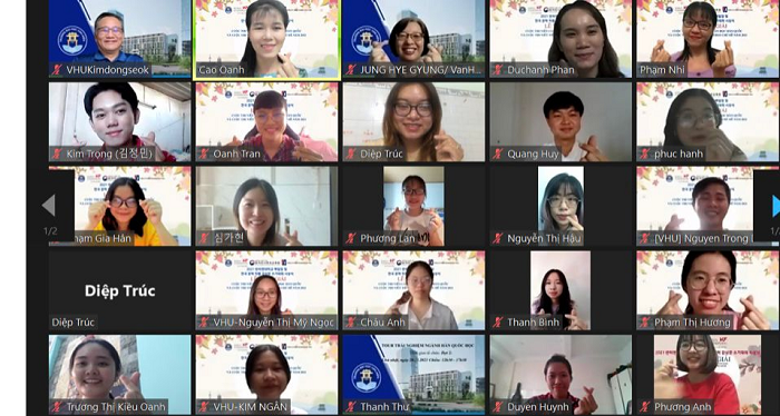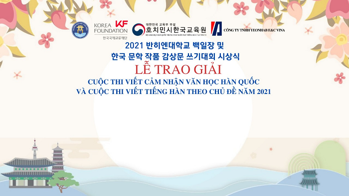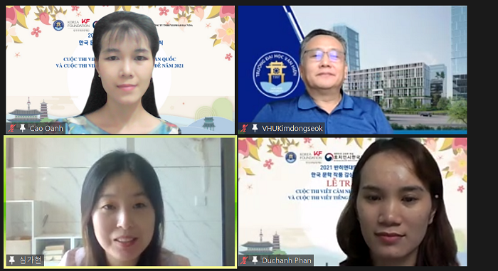 Sáng ngày 11/12/2021 vào lúc 9 giờ, Lễ trao giải của hai cuộc thi “Viết cảm nhận văn học Hàn Quốc” và “Viết tiếng Hàn theo chủ đề” đã được tổ chức bằng hình thức trực tuyến trên ứng dụng Zoom. Mặc dù đây là lần đầu tiên tổ chức và tình hình dịch bệnh Covid-19 còn diễn biến phức tạp nhưng buổi Lễ trao giải đã diễn ra một cách thành công tốt đẹp.