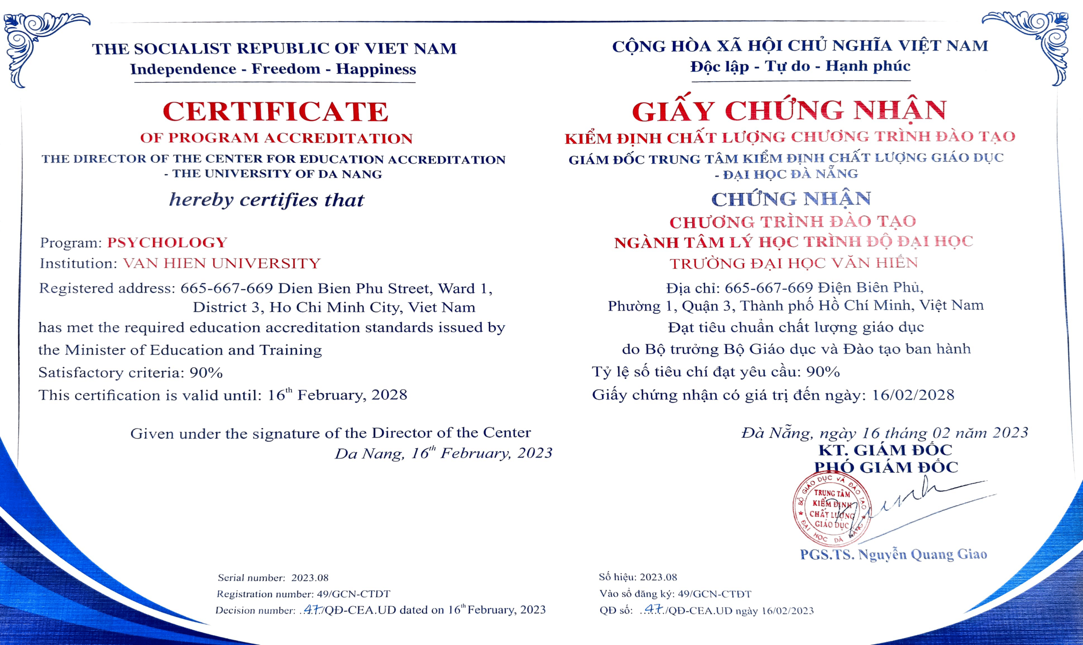 根据第149/QĐ-CEA.UD号决定,该培养方案已全面满足越南教育与培训部部长颁布的教育质量标准。