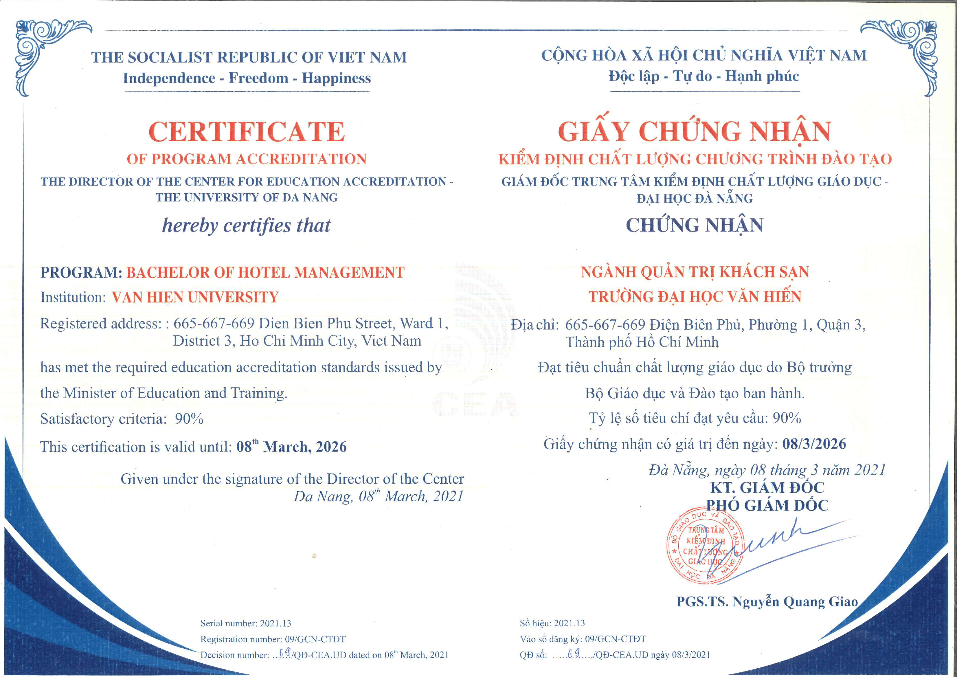 根据第69/QĐ-CEA.UD号决定,酒店管理本科专业的培养方案已全面符合教育与培训部颁布的教育质量标准,其中90%的评估指标达到要求。该认证充分肯定了文献大学酒店管理专业在教学质量、课程建设及人才培养方面所取得的突出成就。