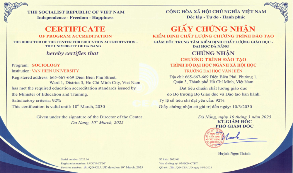 根据第86/QĐ-CEA.UD号决定文件确认,该培养方案已全面符合越南教育与培训部部长颁布的教育质量标准,各项评估指标达标率达92%。