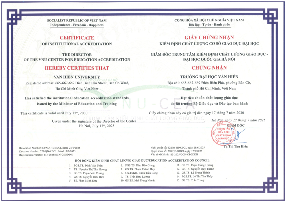 2025年7月17日,根据QĐ-KĐCL第 778号决议,文献大学正式获得越南教育与培训部颁发的教育教学质量审核评估认证证书,这标志着学校完成了第二次的教学审核评估。2020年3月12日,学校已被越南教育与培训部正式认定为符合教育质量标准的高等院校,此次的教学审核评估依然延续了首次的评估结果。